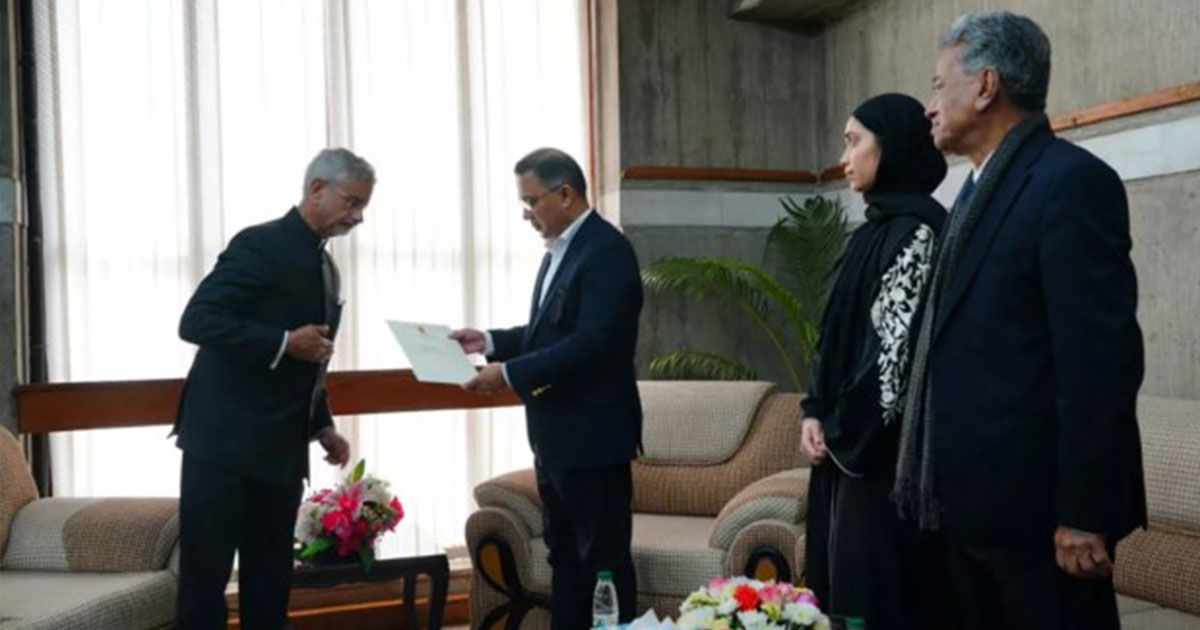 তারেক রহমানের হাতে শোকবার্তা তুলে দিচ্ছেন ভারতের পররাষ্ট্রমন্ত্রী এস জয়শঙ্কর